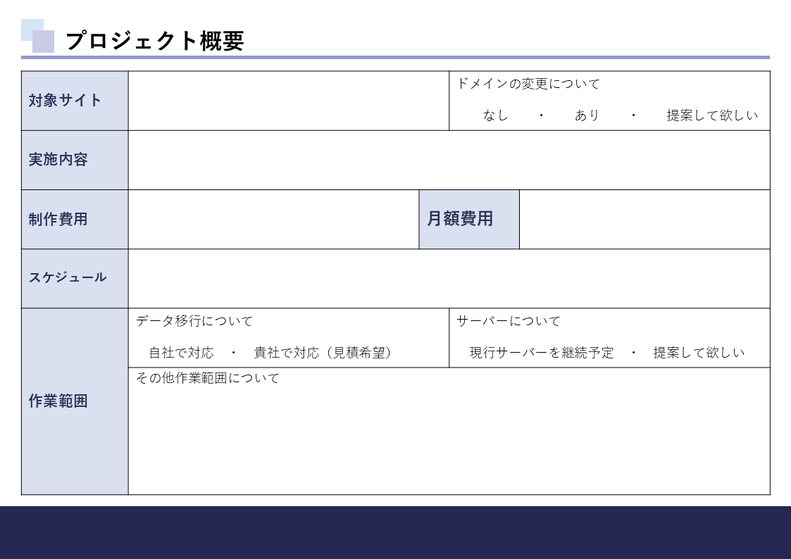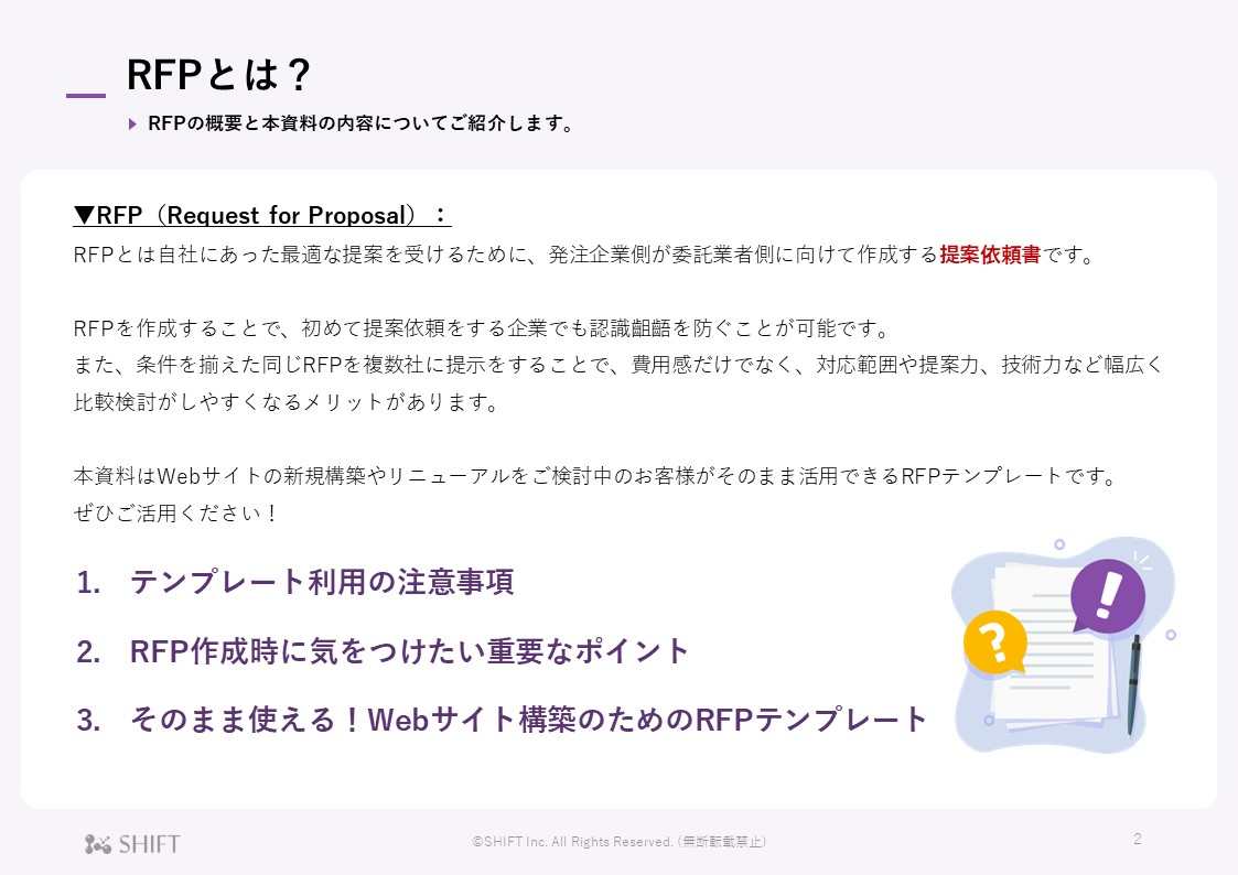 委託業者から最適な提案を受けるために作成する提案依頼書「RFP」。そのまま使えるPowerPointのテンプレートをぜひご活用ください。 【 この資料でわかること 】 ・RFPとは ・RFP作成時に気をつけたい重要なポイント ・そのまま使える!Webサイト構築のためのRFPテンプレート