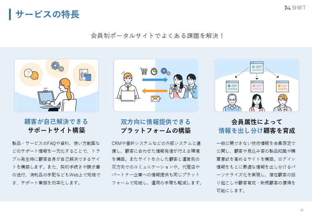 Web上で顧客と繋がる窓口となる会員制ポータルサイト。サポート業務の負担軽減や顧客満足度向上が期待できます。 【 この資料でわかること 】 ・会員制ポータルサイトとは ・サービスの概要、導入事例 ・料金、サーバについて
